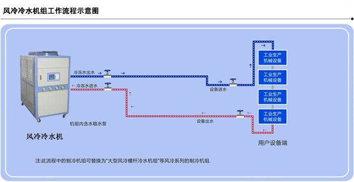 4、風(fēng)冷系列無需配置冷卻水塔及冷卻水泵,安裝簡單,移動方便,適合生產(chǎn)場地比較緊缺的環(huán)境使用;